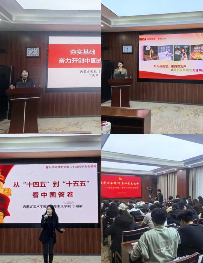 本次宣讲活动特邀团中央青年讲师团成员、北疆青年讲师团成员、内蒙古财经大学谷超,内蒙古自治区“北疆青年讲师团”成员、内蒙古艺术学院丁丽丽和内蒙古党校于美丽三位老师,分别围绕绿色发展、“十五五”中国方案和党的创新理论与发展方向进行讲述,把“大道理”转化为“青年话”,传递主流价值和时代精神。