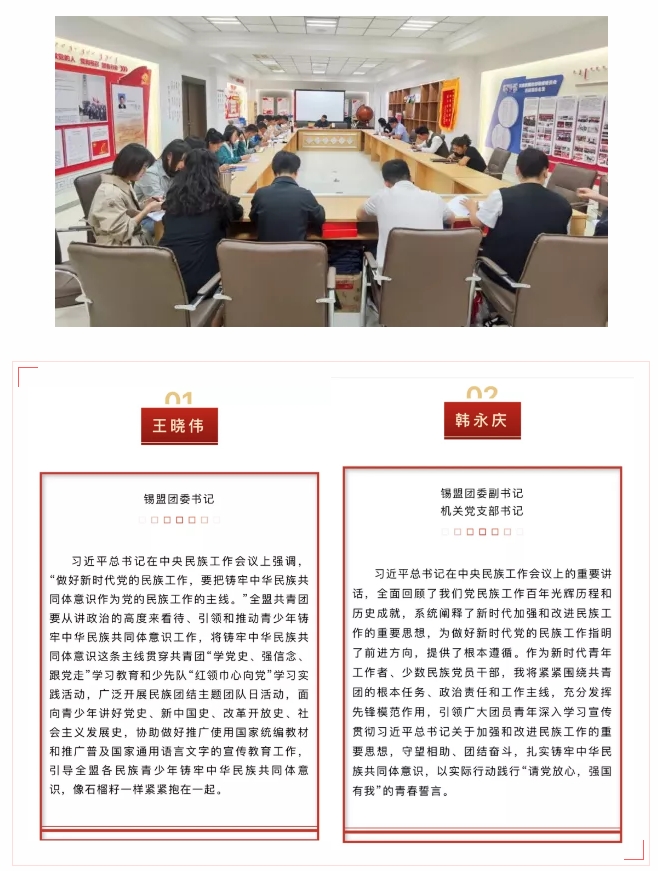 锡林郭勒盟共青团深入学习贯彻习近平总书记关于加强和改进民族工作的重要思想和中央民族工作会议精神,通过举办专题培训、座谈交流、事迹分享、主题演讲、实践教育等主题鲜明、形式多样、丰富多彩的活动,进一步加强青少年民族团结进步宣传教育,教育引导广大青少年扎实铸牢中华民族共同体意识。