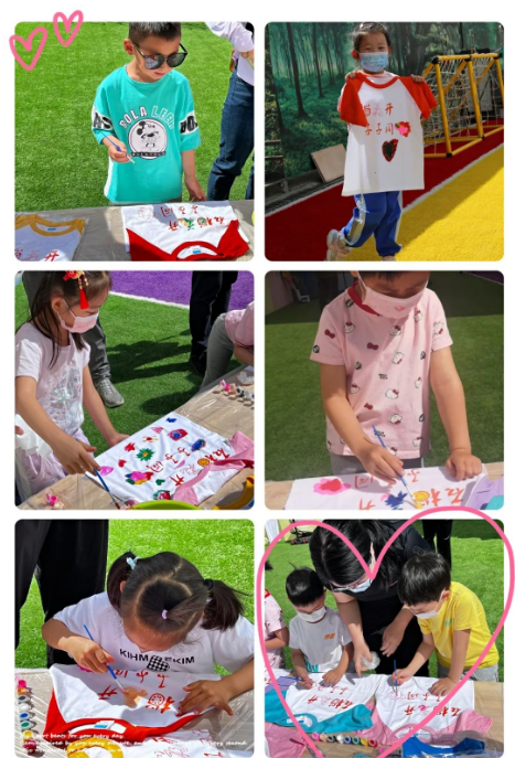 首先进行的是涂鸦活动,小朋友们用颜料在主题T恤上进行涂鸦创作,活动现场既忙碌又温馨,家长和孩子们一起拿着画笔兴致勃勃地投入到绘画中,创作出独一无二的“石榴花”和“小同心”。一幅幅画作妙趣横生,充满童真童趣,一双双小手在艺术土壤里埋下了民族团结的种子。