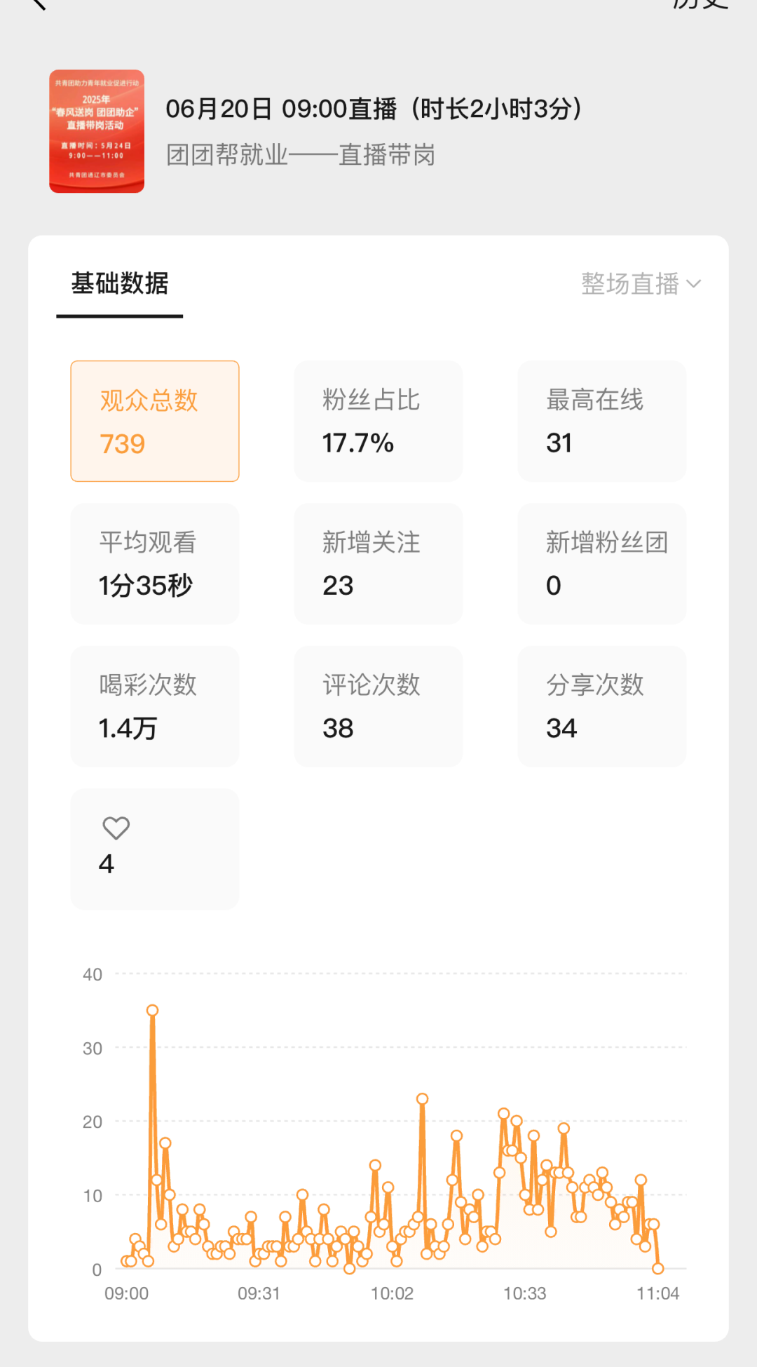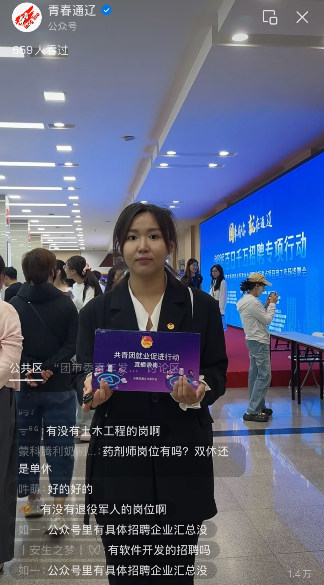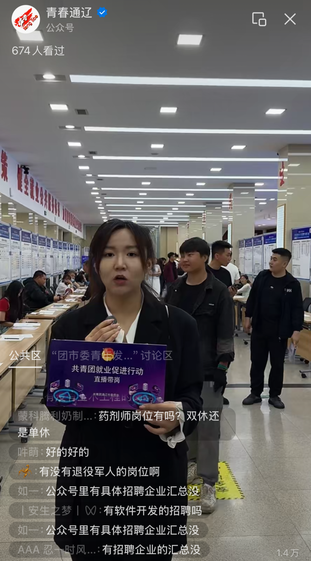 直播环节中,团市委工作人员化身“就业主播”,在“青春通辽”直播间详细介绍用工企业概况、岗位技能要求及福利待遇,并与求职者实时互动答疑。直播活动吸引739人在线观看,累计收获1.4万次点赞,有效提升了岗位信息的传播度与覆盖面。