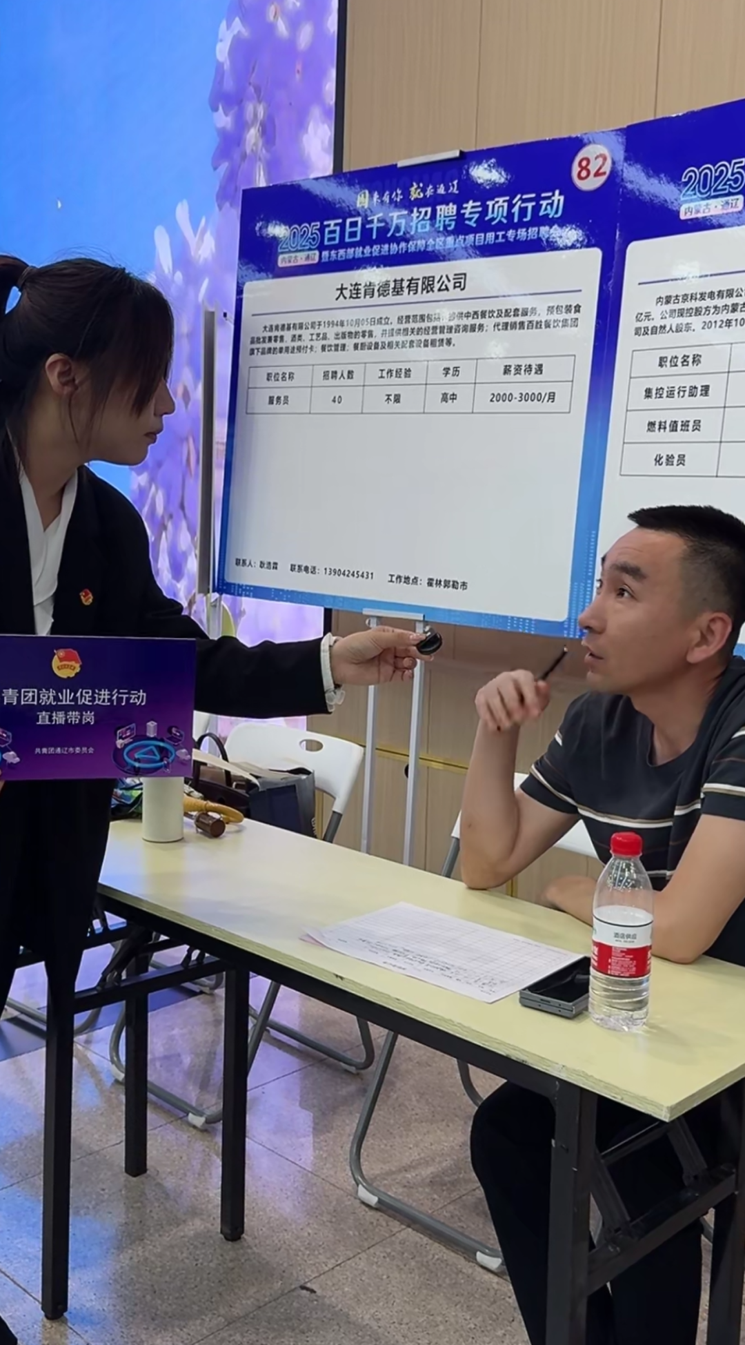 为深入贯彻落实党中央、国务院关于稳就业保就业的决策部署,精准对接青年群体就业需求,搭建高效就业桥梁,6月20日,团市委“青春通辽”直播间走进2025年百日千万招聘专项行动暨东西部就业促进协作保障全区重点项目用工专场招聘会现场开展共青团“就业促进·直播带岗”活动。