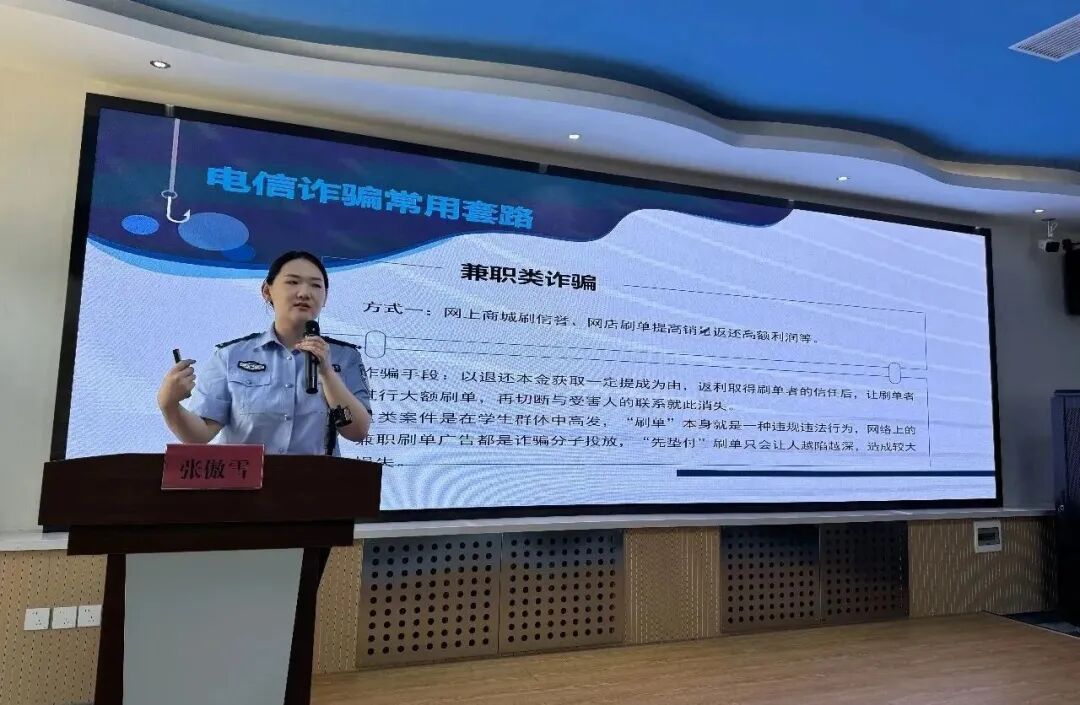 活动现场,通辽市公安局刑侦支队民警张傲雪通过真实案例剖析,揭示了常见的诈骗手段,如虚假招聘、传销陷阱、网络刷单、游戏诈骗等。详细讲解了识别诈骗、防范诈骗的方法和技巧,提醒同学们在学业、生活、求职、创业过程中要保持高度警惕,不轻易相信陌生人的承诺,不随意透露个人信息和收支情况,切实筑牢安全防线,避免陷入诈骗陷阱。活动结束后,不少同学表示,此次宣讲活动让他们受益匪浅,不仅了解到了实用的反诈知识,还提高了自身的安全防范意识,今后一定会将这些知识运用到实际生活中,保护好自己和身边的人。