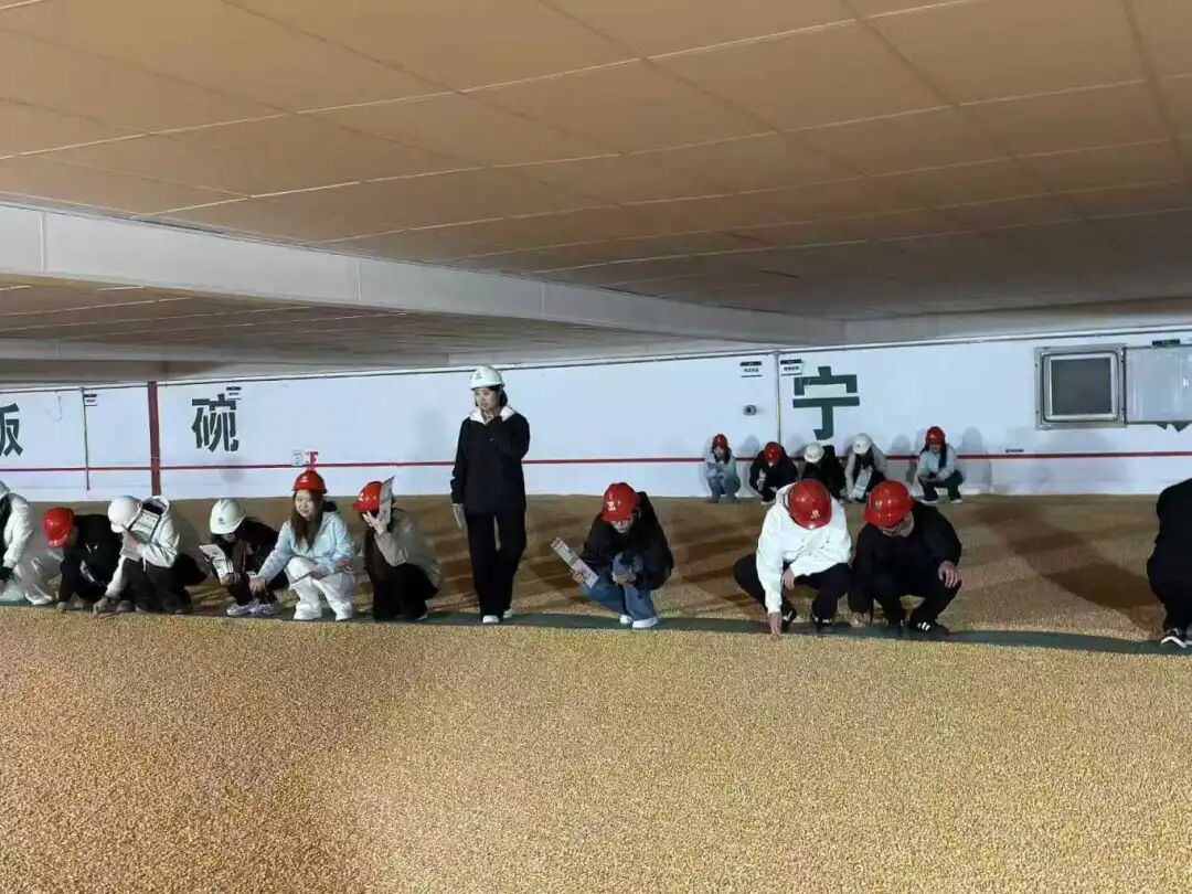 宣讲结束后,青年学子们在工作人员的安全引导下深入库区,系统参观了浅圆仓、立筒仓、平房仓等多类型储粮设施,直观了解不同仓型在储粮容量、适用粮种等方面的差异化优势,对现代化粮仓的规模化布局有了整体认知。工作人员带领学子们进入粮仓内部,了解氮气储粮和环流熏蒸,并亲手触摸了颗粒饱满的储备粮。在这过程中,大家都深刻体会到每一粒粮食从田间到粮仓的来之不易,进一步筑牢“爱粮、惜粮、节粮”的思想自觉。