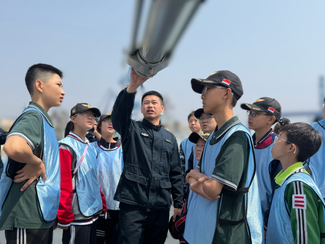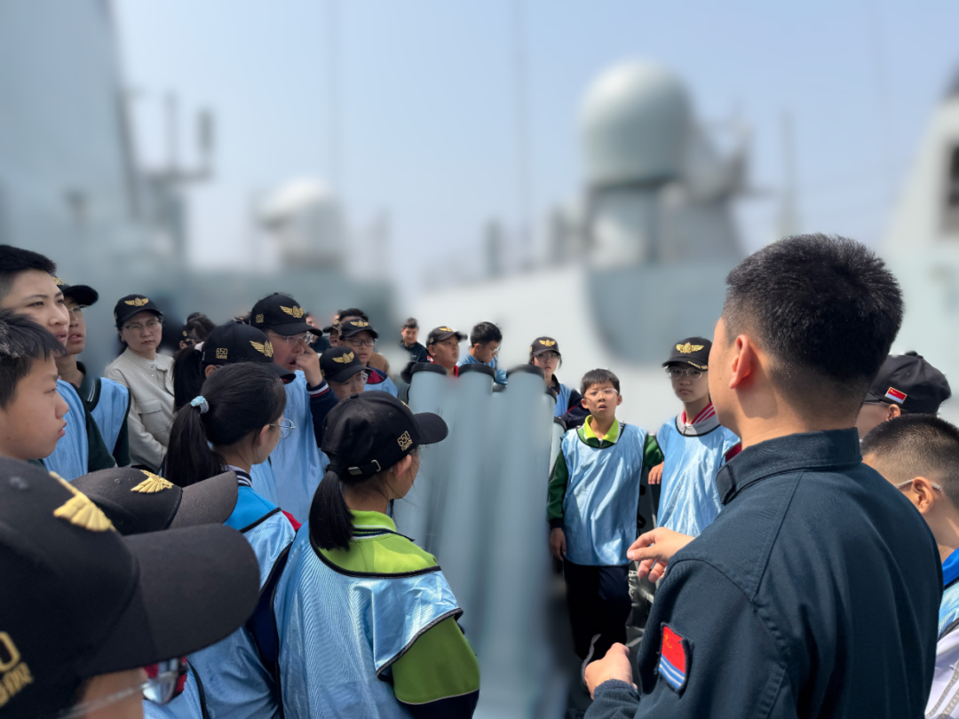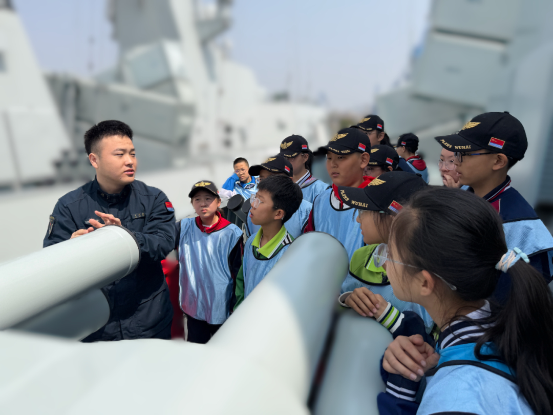在舰炮旁,一名同学仰头追问。官兵耐心解答,从射程到装填步骤,一一细说。孩子们一边零距离感受大国重器,一边深切体会人民海军守卫海疆的热血与忠诚。