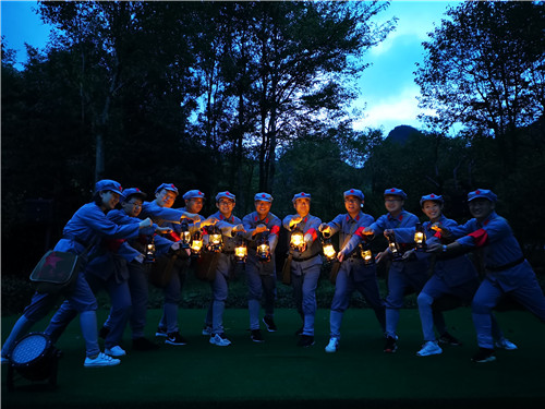 在红歌联唱激情教学中,全体学员以小组组队,集体研究设计队名、队形、口号,自选红歌曲目。各组整齐列队登台展示,现场气氛热烈,嘹亮的红歌响彻山谷,大家用歌声尽情抒发爱党爱国情怀。