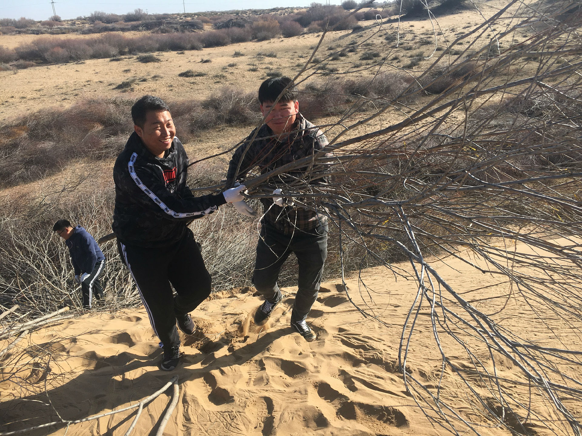 此次植树任务主要是栽种沙障,通过就地取材,将沙漠中生长的沙柳树枝砍下,在沙面上每隔10米以条形的形状铺种,形成生物沙障,以此来消减风速、固定沙表制止环境再度恶化并改善生态环境。经过一天紧张辛苦的劳动,原先一望无际的沙漠戈壁被沙柳枝铺成的沙障装点的丰富生动,展现出蓬勃的生机与活力。