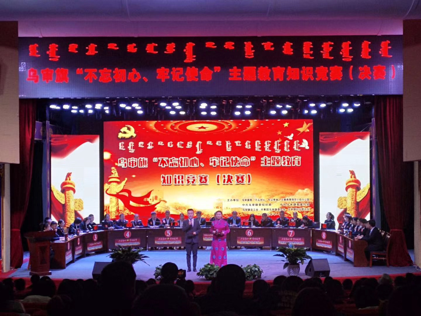 由乌审旗委“不忘初心、牢记使命”主题教育领导小组办公室、旗委组织部、旗委宣传部、旗总工会、团旗委和旗妇联联合举办的“不忘初心、牢记使命”主题教育知识竞赛决赛11月25日在乌审旗文化宫举行。旗人大常委会副主任栗秀峰、旗政协副主席雷哈斯以及各主办单位负责人出席本次活动。