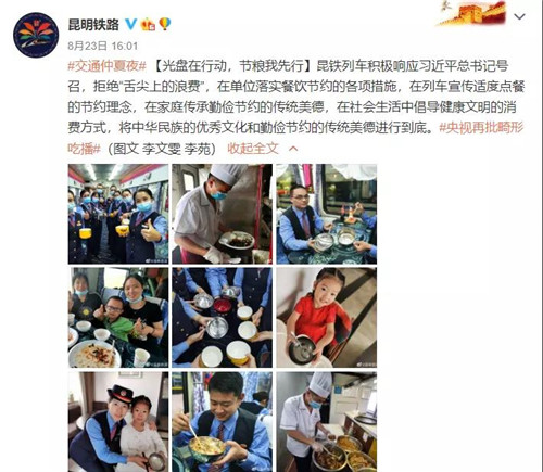 中国铁路昆明局集团有限公司利用报纸、“昆铁+”APP以及微博微信等方式开展“珍惜粮食、节约食物”主题宣传,引导干部职工身体力行、勤俭节约。
