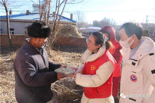 近日,杜尔基镇杜尔基嘎查新时代文明实践站志愿者开展“暖冬”活动,为脱贫户送爱心饺子。