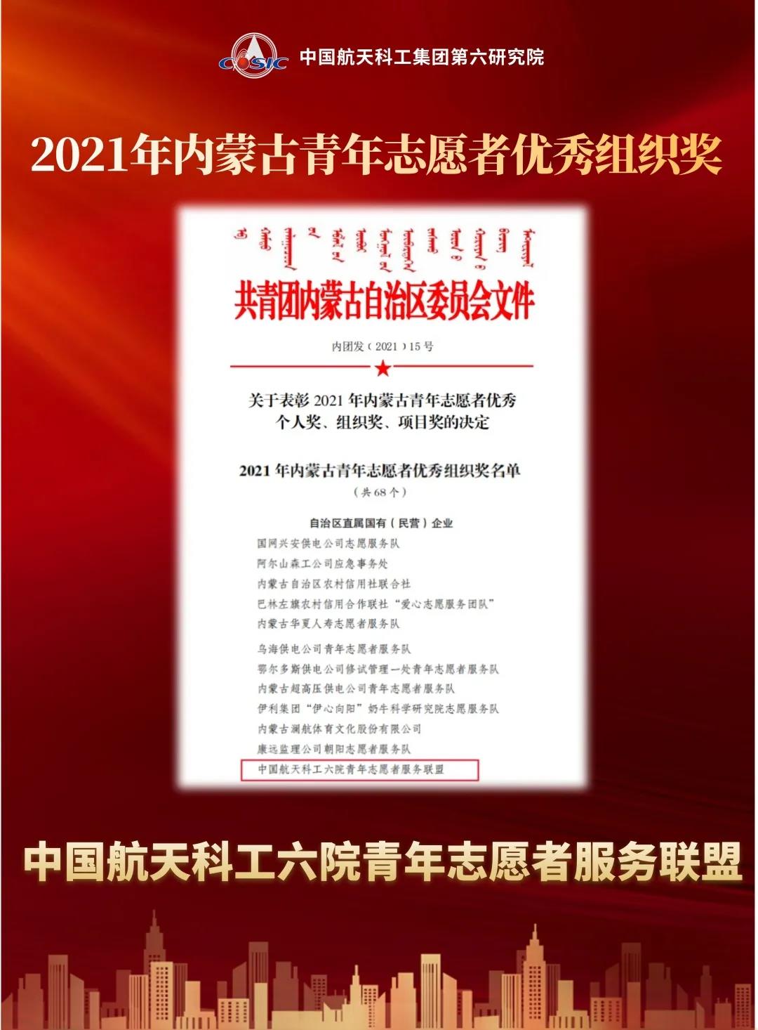 喜讯:中国航天科工六院青年志愿者服务联盟荣获“2021年内蒙古青年志愿者优秀组织奖”!据悉,六院青年志愿者服务联盟由六院团委发起创建,共有青年志愿者95人,该奖项为六院首…